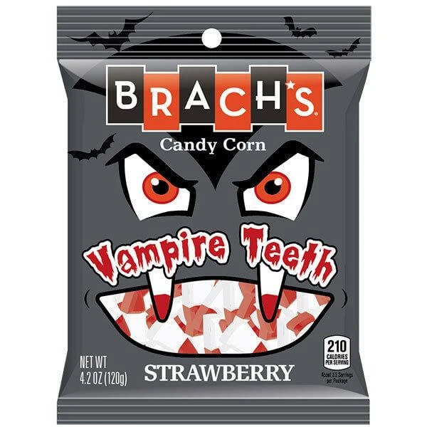 Box contains 3 pounds of Brach’s Vampire Teeth Strawberry Candy Corn packed in 12 bags, each with a net weight of 4.2 ounces.