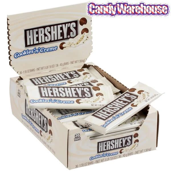 Display box contains 36 Hershey’s Cookies ‘n’ Cream Candy Bars, each with a net weight of 1.55 ounce.
