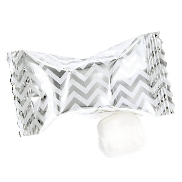 The chevron design can be found in works of art dating back thousands of years. Archaeological recovery of artifacts from the palace of Knossos on Crete (an island off the coast of modern day Greece) revealed the symbol on ancient pottery created as long ago as 1800 BC! It was also a prominent pattern on rock carvings and medieval coats of arms. But our favorite place to find this spiffy, angular design? Why, on candy, of course! And nothing is sweeter than buttermint creams all wrapped up and dressed to impress in snazzy silver and white chevron suits!