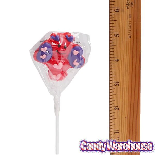 Box contains 12 wrapped Valentine Bug Character Lollipops.