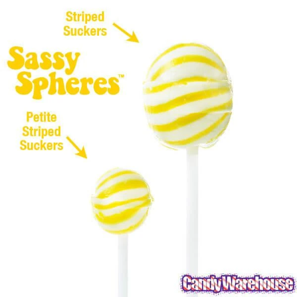 Bag contains 100 individually wrapped Yellow Sassy Suckers Striped Ball Lollipops.
